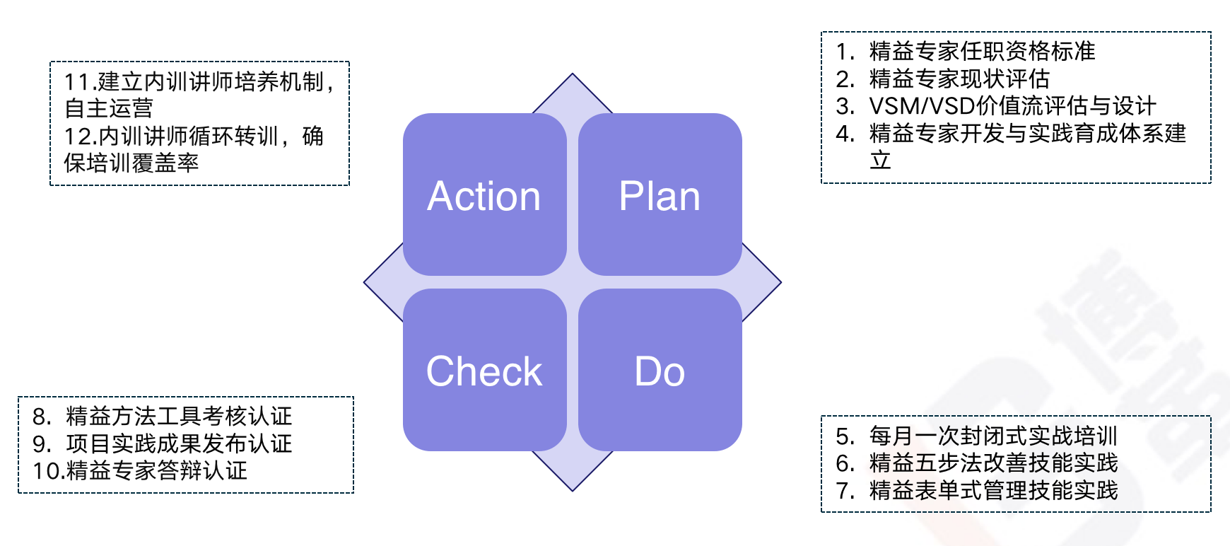 將精益的理念、行為、機制、方法、工具等融入到精益五步法中,能系統地提升科長、經理級人員的精益專家,使其在工作崗位中能從面的角度逐層分析,發現改善機會;確定實施策略并調整相關資源,從而制定計劃并實施,提升整體效率最終標準化人員的思維和行為。