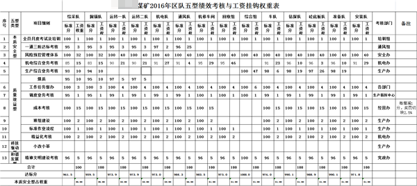 2016年1月份開始,精益化管理正式調整為一級考核指標,工資權重5%,不同單位按照專業不同下設二級指標,考慮到考核平衡性問題,不同單位根據精益化管理提升空間和考核指標數量不同,二級指標數量、考核指標、二級指標權重比例、五型績效加扣分標準有所區分。