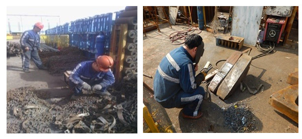 ♦ 井下回收上來的水管吊掛鏈及水管卡子螺栓銹蝕嚴重,在井下無法分離,回收組組織進行用氣割將其連接處割開,將鏈子和水管卡子分類碼放,以便再用