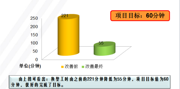6)快速換模:通過換形動作分析,換形過程中舞步圖分析,制定換形改善方案,并建立換形標準作業指導書,換形時間由221分鐘降低至55分鐘。