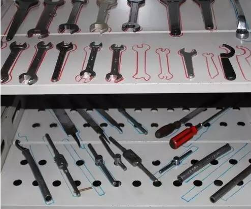 如果視覺和使用效果好,也可以直接在存放物品的載體上標記。如下圖所示,在掛板上畫上這個工具的形狀,工具被取走能一目了然的顯示出來,萬一工具丟失了也能得到及時的補充。