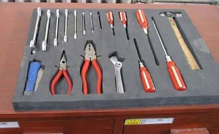 方法2:采用嵌入凹模的方法,使工具、零部件等物品易于取用和歸位。如沒有可用的現成凹模,可以自己動手,利用海棉、泡沫或厚質的臺墊,刻劃出物品形狀后,鏤空處理即可。