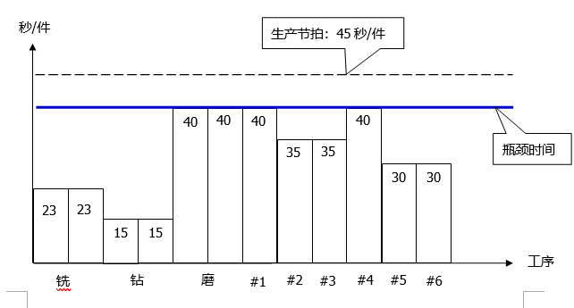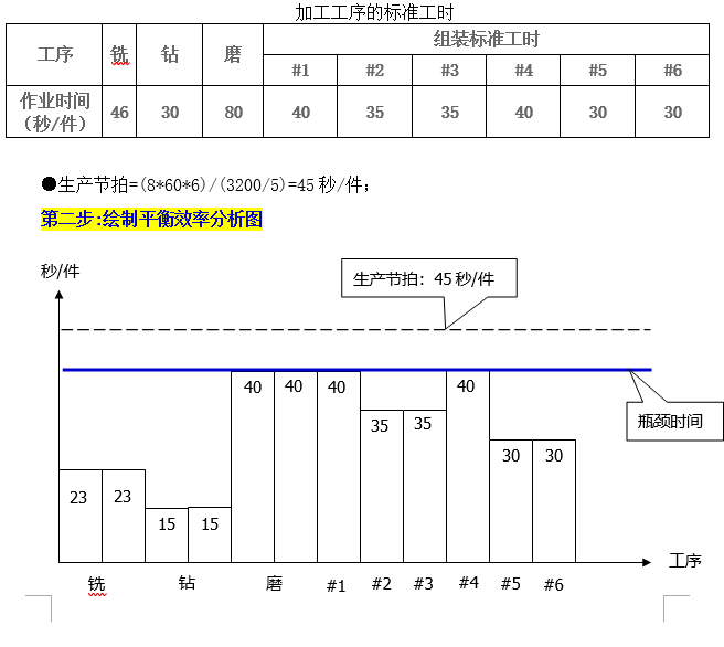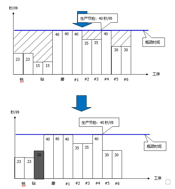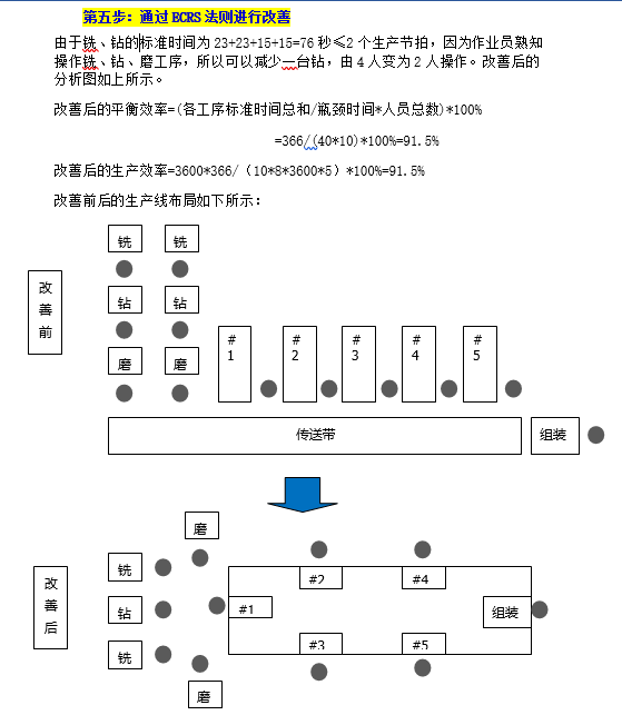 該廠某系列產(chǎn)品的加工工藝流程為銑→鉆→磨→組裝。該車間實行5天8小時工作制,每周的產(chǎn)量為3200件。該加工廠生產(chǎn)線平衡改善如下: