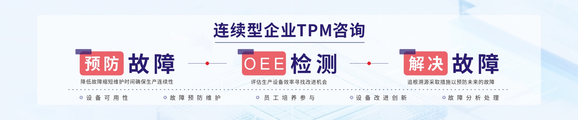 02 設備運維管理 博革咨詢TPM推進采取“自主維護”+“專業(yè)維護”雙軌制的模式;PM的咨詢老師具有設備管理專業(yè)背景(設備工程師/電氣工程師/二級技師/PLC工程師/中國設備協(xié)會會員等),在大型企業(yè)設備總監(jiān)/經理的從業(yè)經歷,并具有大型線纜行業(yè)經驗,擅長解決設備專業(yè)難題;AM的咨詢老師擅長自主維護標準和流程管理,營造全員改善氛圍,提升設備維護技能等